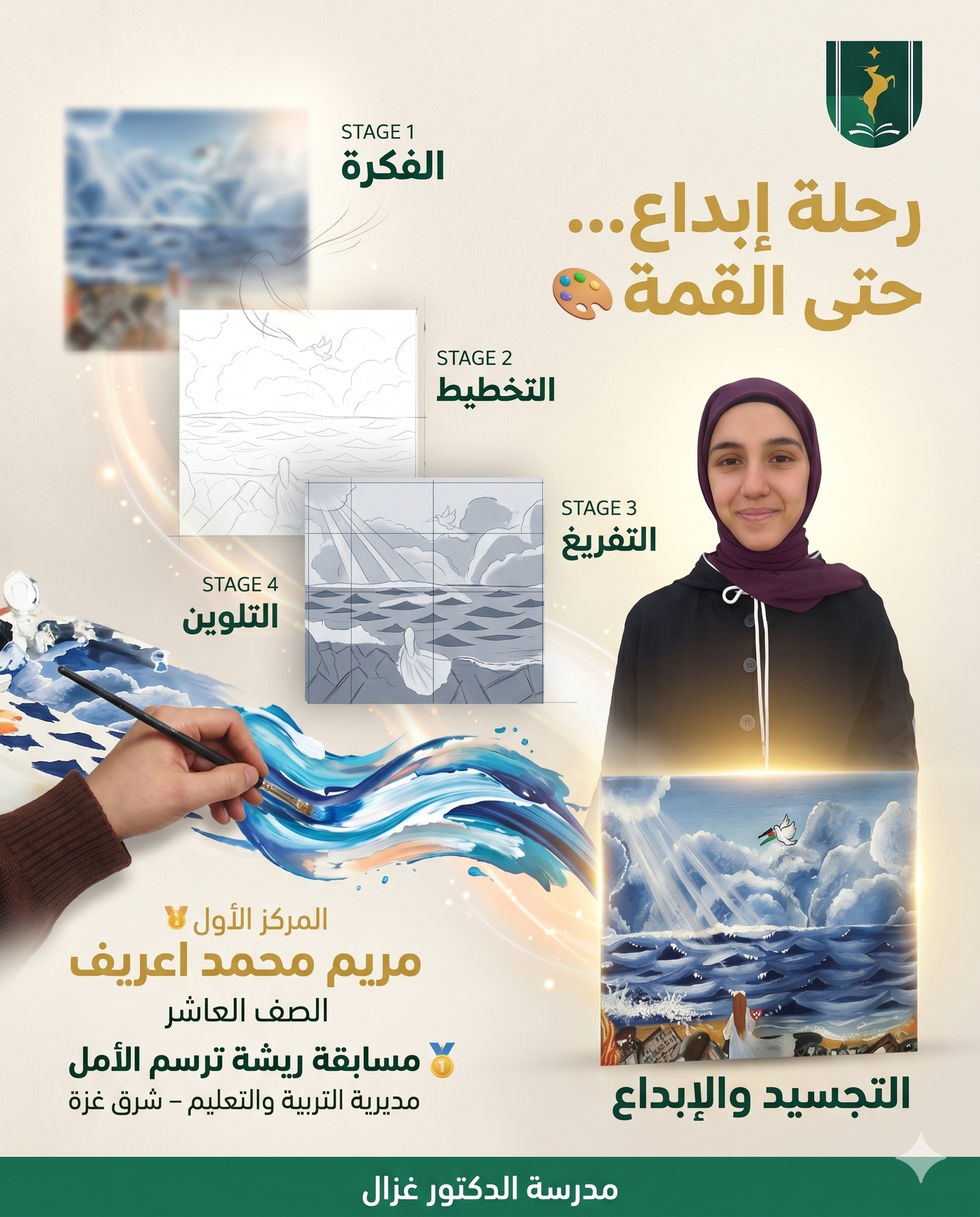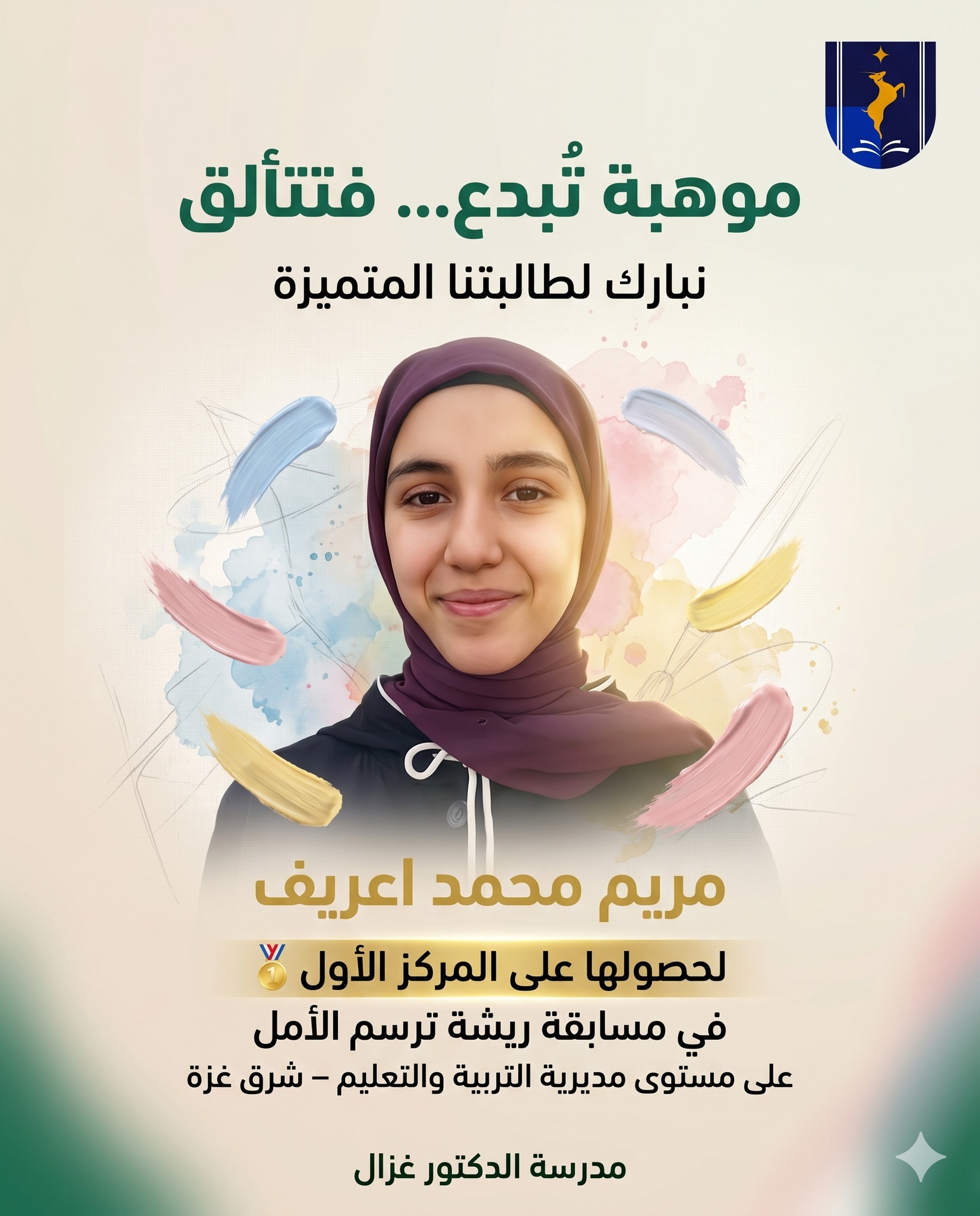 من فكرة… إلى إنجاز 🎨✨ نبارك لطالبتنا المبدعة مريم محمد غازي اعريف – الصف العاشر لحصولها على المركز الأول 🥇 في مسابقة "ريشة ترسم الأمل" على مستوى مديرية التربية والتعليم – شرق غزة. 💚 في مدرسة الدكتور غزال… نصنع الإبداع، ونحوّل الموهبة إلى إنجاز.