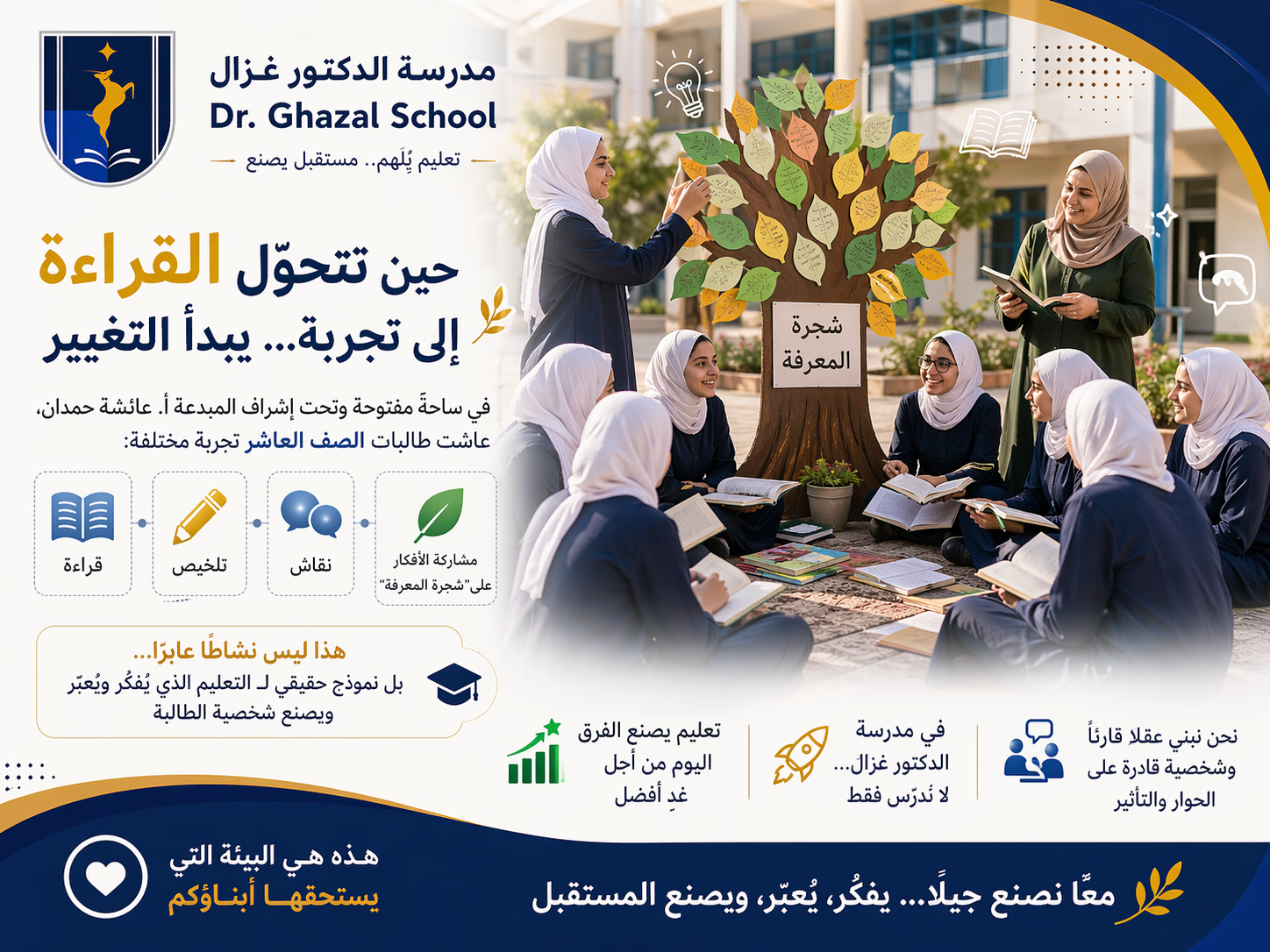 🎥✨ حين تتحوّل القراءة إلى تجربة… يبدأ التغيير في ساحةٍ مفتوحة وتحت إشراف المبدعة أ. عائشة حمدان، عاشت طالبات الصف العاشر تجربة مختلفة: 📚 قراءة… ✍️ تلخيص… 💬 نقاش… 🌳 ومشاركة الأفكار على “شجرة المعرفة” هذا ليس نشاطًا عابرًا… بل نموذج حقيقي للتعليم الذي يُفكّر ويُعبّر ويصنع شخصية الطالبة. 🚀 في مدرسة الدكتور غزال… لا نُدرّس فقط نحن نبني عقلًا قارئًا… وشخصية قادرة على الحوار والتأثير. 🌟 إن كنتم تبحثون عن تعليم يصنع الفرق… 📩 هذه هي البيئة التي يستحقها أبناؤكم